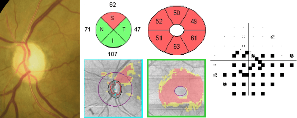Both the visual field and ganglion cell defects were out of proportion to the RNFL OCT thinning. The presence of pallor should immediately raise suspicion of a non-glaucomatous process and the discordant imaging results further compound this suspicion. After requestioning the patient and requesting old records, it was clear that the patient had an episode of NAION years ago and the current findings were all sequelae of that event. Due to the presence of old records, further evaluation was not necessary and the patient was monitored for stability.